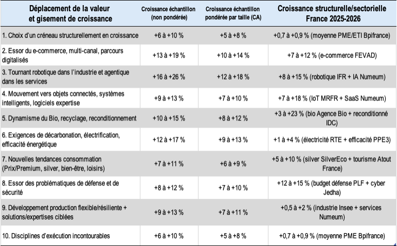 La croissance de l’échantillon non pondérée : Moyenne arithmétique des estimations individuelles (rapports annuels 2025, Usine Nouvelle, Les Echos, Bpifrance baromètres sectoriels Q1 2026). Ce sont des valeurs indicatives.