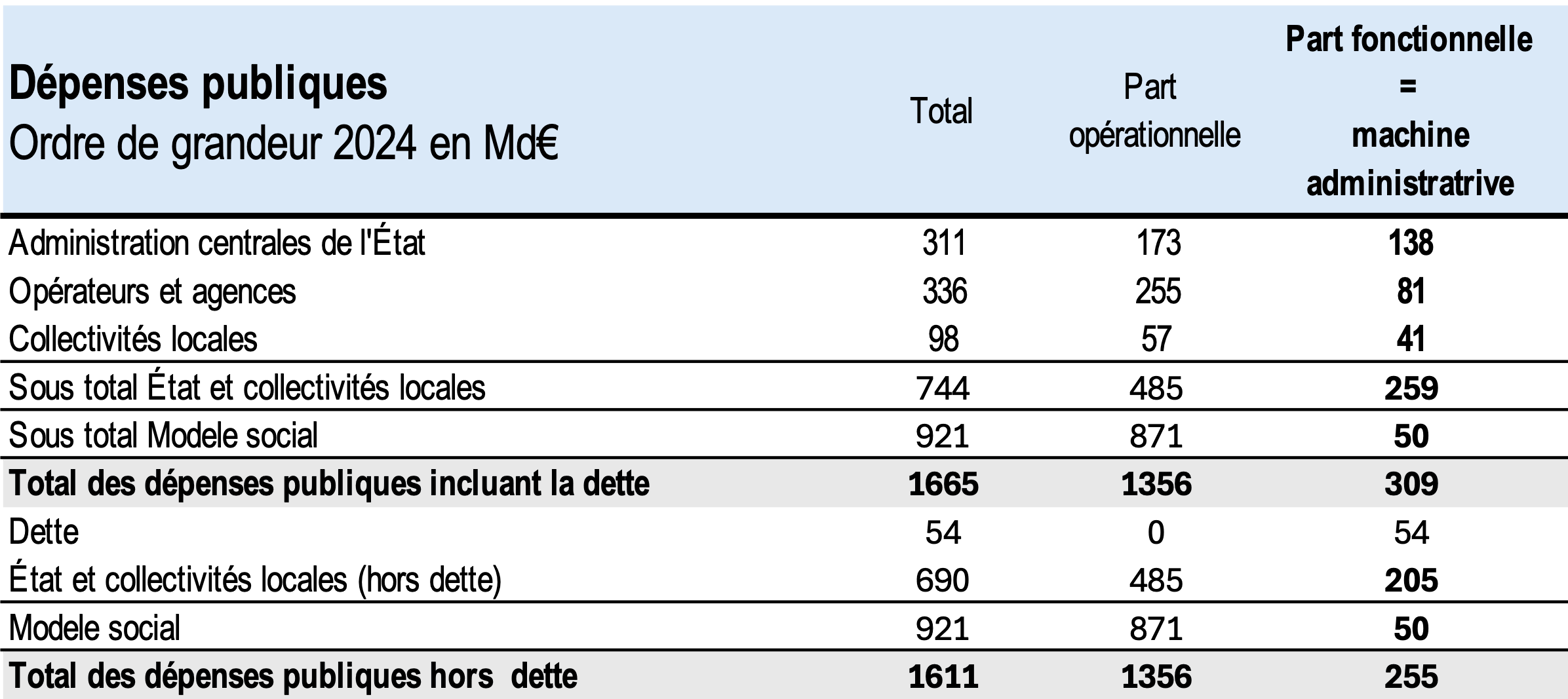 Quelques précisions sur l’approche. J’ai volontairement isolé la “machine administrative” – hors social, hors dette, hors missions opérationnelles. Les transferts de l’État vers les régimes sociaux (retraites, santé, famille, chômage…) sont intégrés au modèle social dit « élargi ». L’estimation du coût – ordre de grandeur – de la machine administrative est ainsi prudente. C’est ma propre synthèse, réalisée à partir de sources officielles et indépendantes : INSEE, rapports de la Cour des comptes et du Sénat (2024), données du PLF 2025-2026, ainsi que les travaux de référence de FIPECO et de l’iFRAP.